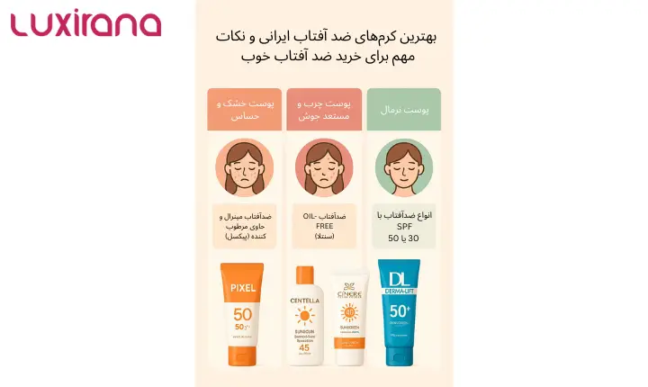 در این مطلب ضمن معرفی بهترین کرمهای ضد آفتاب ایرانی، به بررسی نقاط مثبت و منفی آنها میپردازیم. همچنین در پایان یک راهنمای کوتاه برای انتخاب ضد آفتاب مناسب بر اساس نوع پوست ارائه میکنیم.